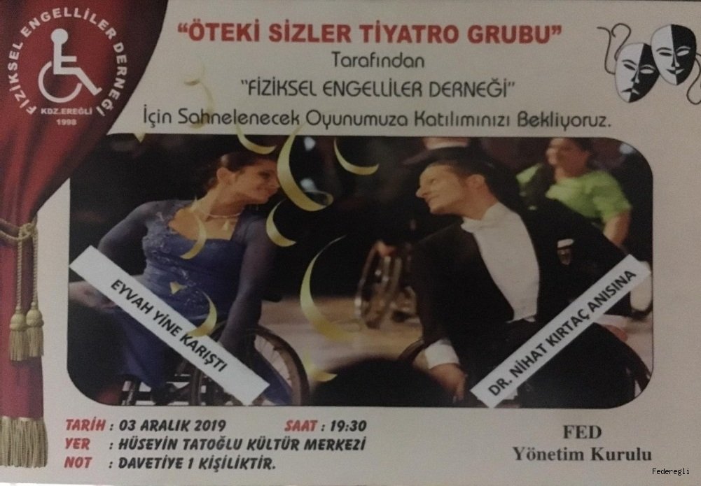 Zonguldak’ın Ereğli ilçesi Öteki Sizler Tiyatro Grubu tarafından Dr. Nihat Kırtaç anısına ve Fiziksel Engelliler Derneği yararına ‘Eyvah Yine Karıştı’ oyunu sergilenecek.3 Aralık Salı Günü Hüseyin Tatoğlu Kültür Merkezinde saat 19.30’da ‘Eyvah Yine Karıştı’ oyunu sergilenecek. Öteki Sizler Tiyatro Grubu tarafından Dr. Nihat Kırtaç anısına ve Fiziksel Engelliler Derneği yararına olacak oyunda; İbrahim Kayacan, Engin Ay, Hakan Karataş, Beste Duman, Derya Gür, Nurcan Sağlam, Dilek Taşdelen, Levent Duman, Hakibar Yılmaz, Göksel Özer, Elif Koç ve Halil Bozkurt sahne alacağı öğrenildi.